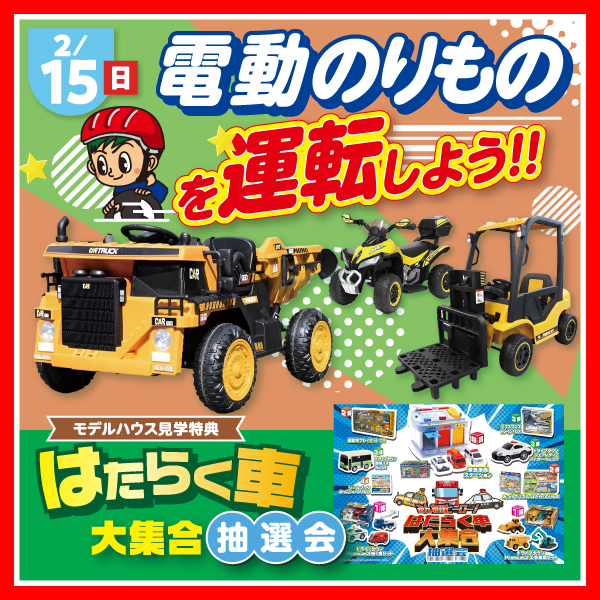 2/15(日) 🛵電動のりものを運転しよう!,はたらく車大集合抽選会🚓