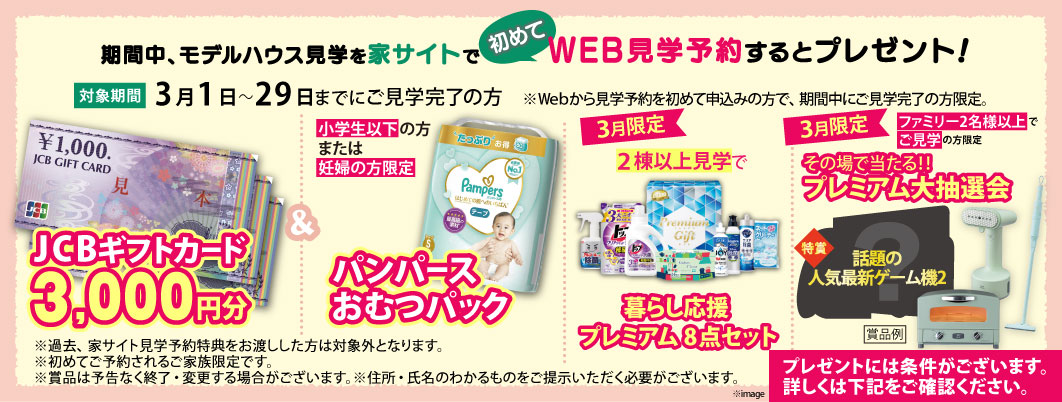 ※過去すでにお申込みいただき、見学予約特典をお渡しした方は対象外となります。また、お電話でのご予約の場合も対象外となります。予めご了承下さい。
