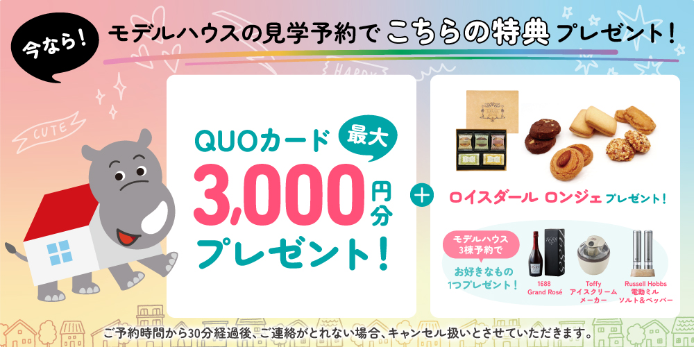 注1)住宅購入をご検討いただいている方限定。注2)特典1は1モデルハウスにつき「QUOカード1,000円分」、期間を問わず最大1家族様3モデルハウスまでとなります(無くなり次第終了)。注3)過去に当会場の予約特典を受け取られた方はプレゼント対象外となります。注4)当日の無断キャンセルは、次回よりご予約をお受けできない場合がございます。事前にご予約されたメーカー様へ直接ご連絡ください。