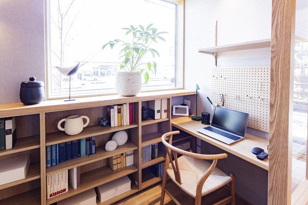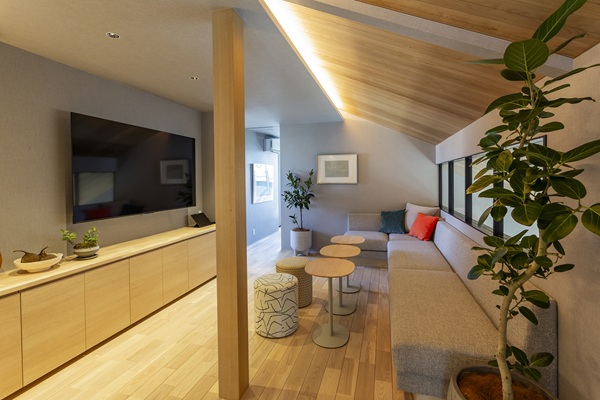 住友林業の強靭な構造「ビッグフレーム構法」により、外部空間と一体感を感じることが出来る開放感のあるLDK空間を実現しました。外観は、シンプルな大屋根を基調としながらも、軒の深さを強調した安定感のあるデザインとし、内観は、大きな勾配天井に当社らしい贅沢でダイナミックな木質感を演出しております。住友林業の「プラスカイ」を活かした、将来的に1階部分で簡潔できる間取りを取り入れておりますので、平屋としてもご見学いただけます。線の美しさからあふれる綺麗な空間、大開口の窓が生み出す開放感、木に包まれる安心感、住友林業の「今」をぜひご体感くださいませ。