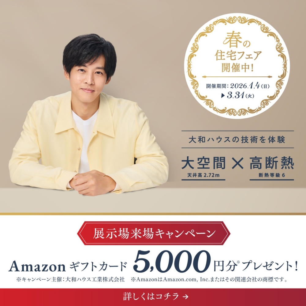 2026年1月4日~3月31日の期間中、大和ハウスの公式WEBサイトから「住宅展示場」にご予約の上、ご来場いただき、各種相談(AIプラン診断、ファイナンシャルプランナーによるライフプラン相談(無料)、土地の敷地調査、物件見学、建物見学)の次回の商談を予約&実施いただいた方には「Amazonギフトカード5,000円分」をプレゼントします。