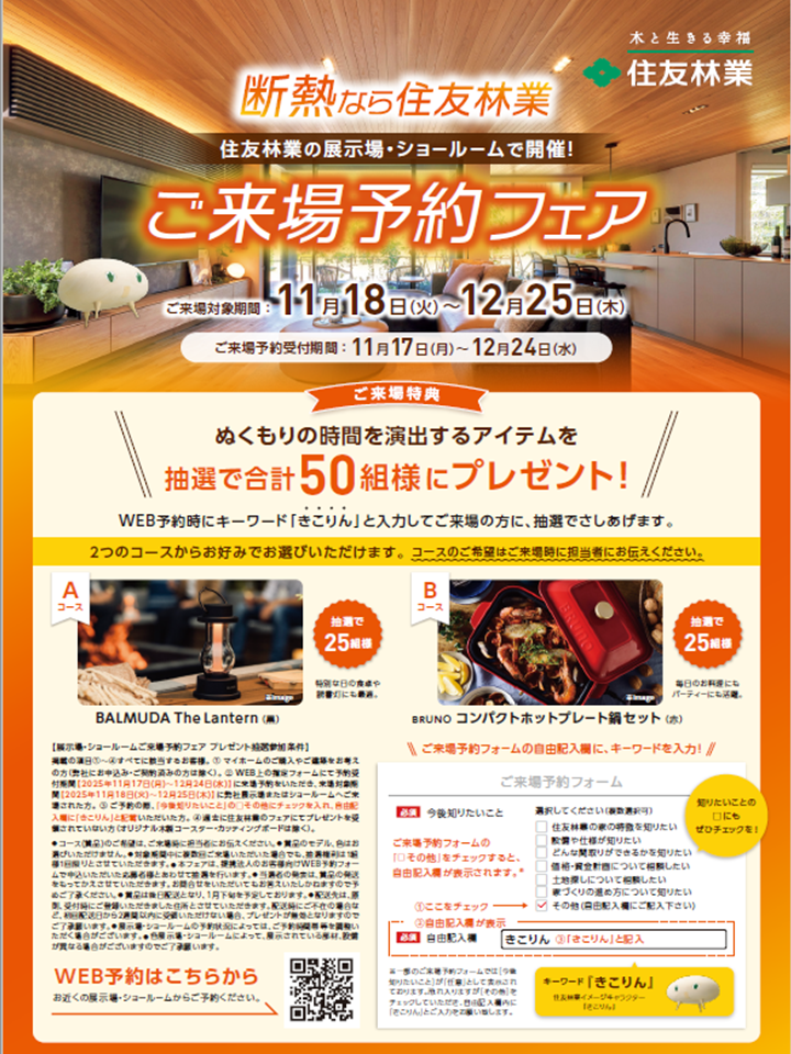 11月18日~12月25日の間に来場予約より当社の展示場にご来場いただいたお客様に素敵なプレゼントの抽選にご参加いただけます!
