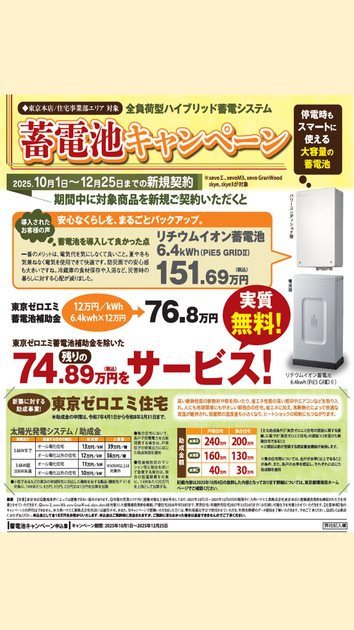 東京ゼロエミ蓄電池補助金76.8万円を除いた残りの金額74.89万円をサービス!