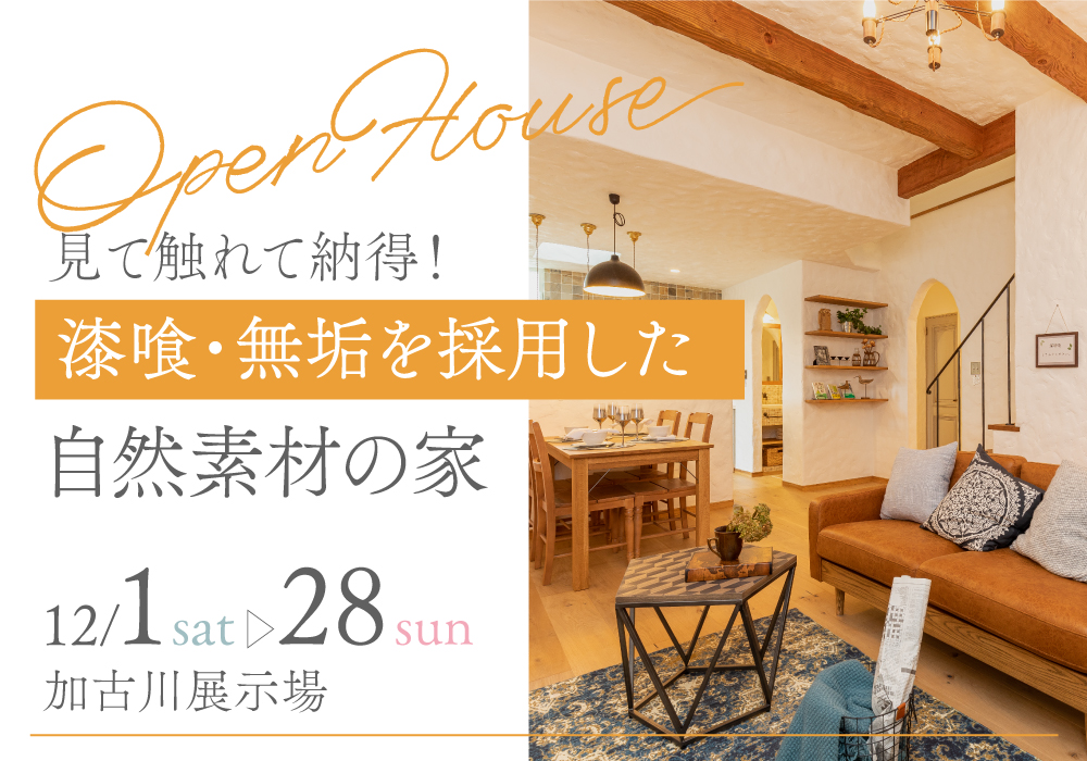 加古川展示場は、床から天井まで、漆喰・無垢材を使用した、可愛いだけでなく身体にも心にも優しいモデルハウスをご覧いただけます。