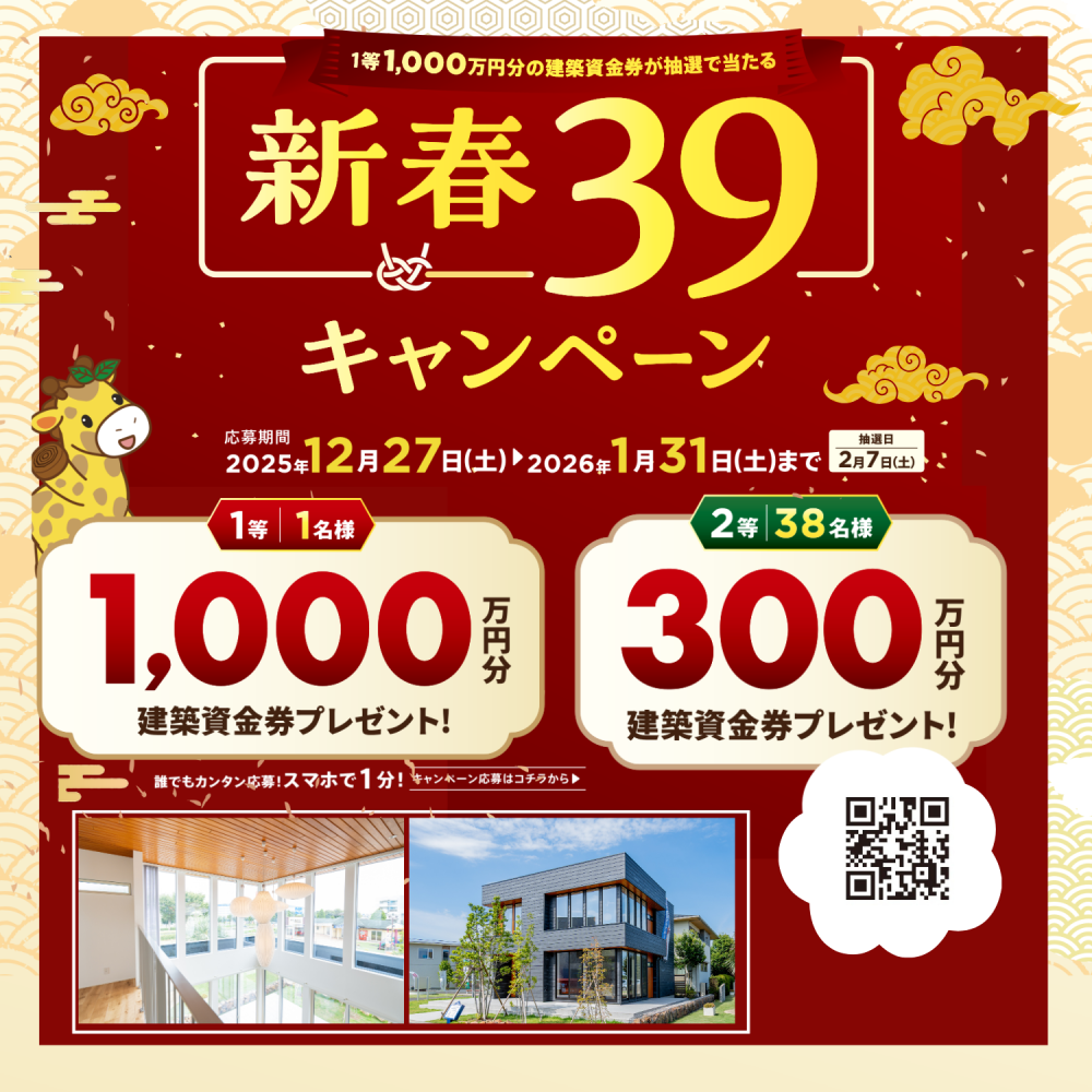 抽選で39名様に建築資金券をプレゼントするキャンペーンを開催中です。