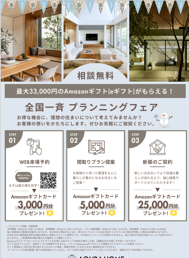 注文住宅に興味がないなど、明らかにプレゼントのみを目当てとされていると弊社が判断した場合は対象外となります。