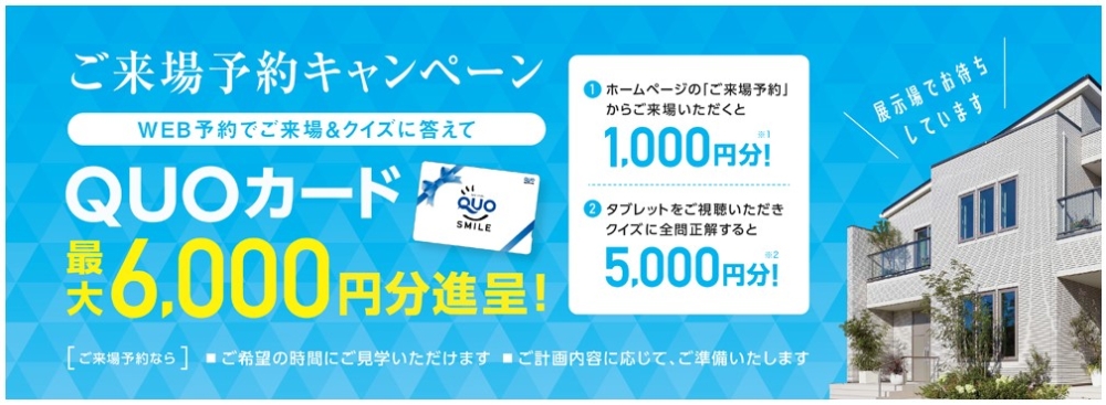 モデルハウスを初めてご見学される方に、最大6000円分のQUOカードをプレゼントしております!