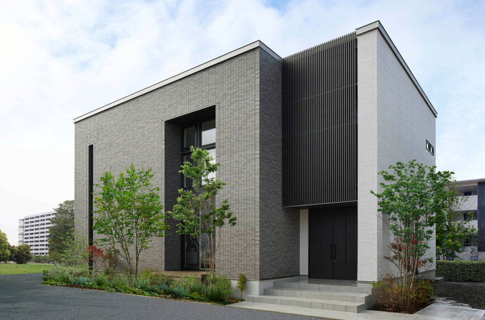 無駄をそぎ落としたボックス型のフォルムに、アクセントとしてルーバーを採り入れたシンプルな外観デザインの「札幌北24条展示場」は、内装に木目と深みのある色のタイルやアイアンを用い、落ち着いた雰囲気を演出。開放感を味わえる吹抜リビングや、スキップになったダイニング、半地下のシアタースペース、ロフト付きの子ども部屋など、縦空間の活用アイデアも見どころです。ダイニングを中心に、リビング、キッチン、洗面所、ランドリースペースを通ってリビングに戻る回遊動線が暮らしやすさを感じさせます。