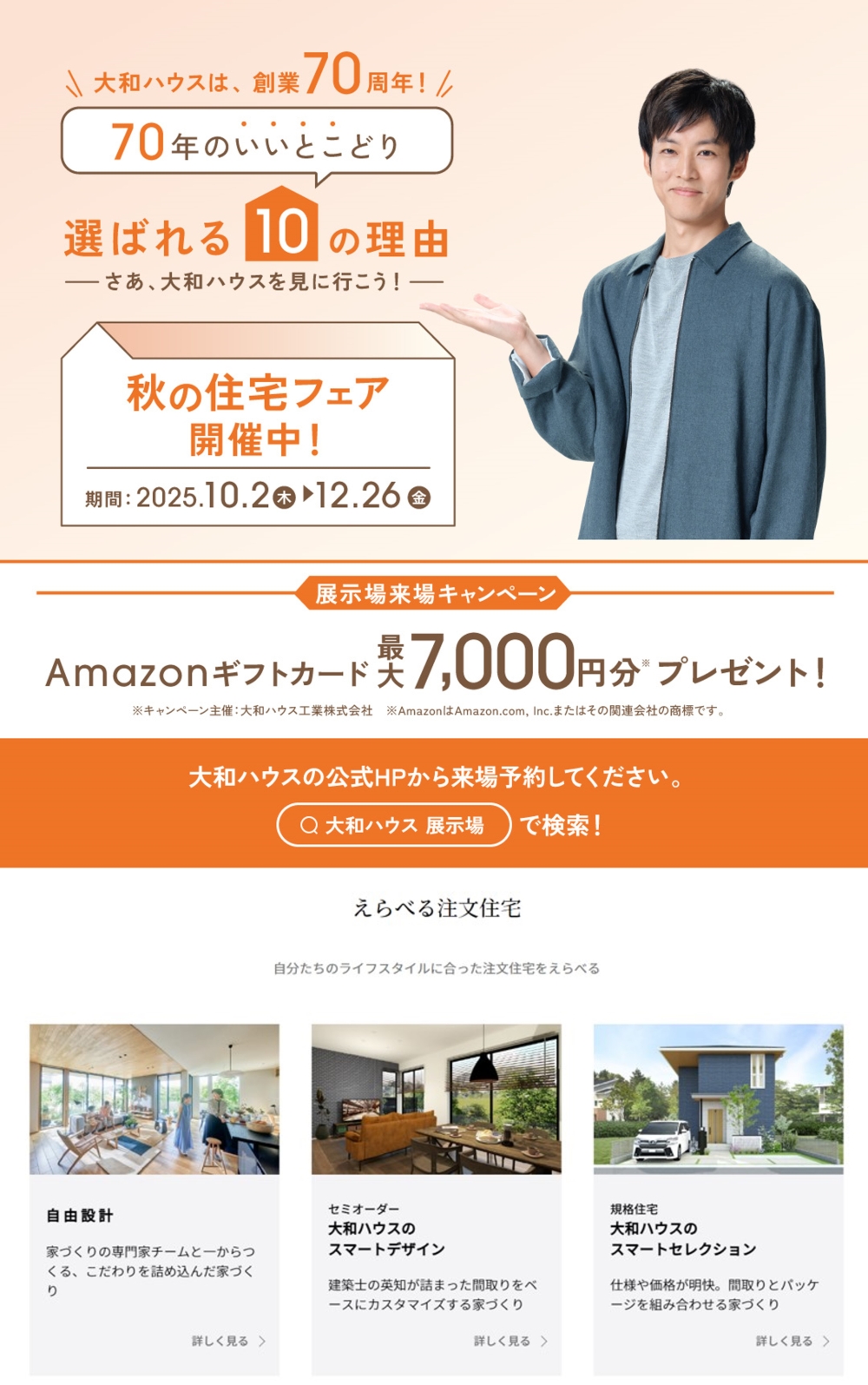 2025 年 10 月 2 日~12 月 26 日の期間中、大和ハウスの公式 WEB サイトから「住宅展示場」にご予約の上、ご来場いただいた方には「Amazon ギフトカード 4,000 円分」をプレゼント。
