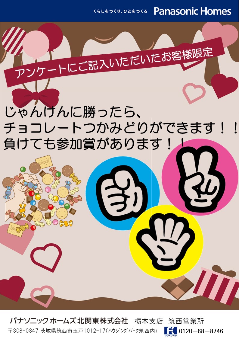 アンケートにご記入いただき、営業担当とじゃんけんをして勝つと、チョコレートのつかみ取りが出来ます!負けてしまっても参加賞があります。ご家族皆さまで遊びに来てください。