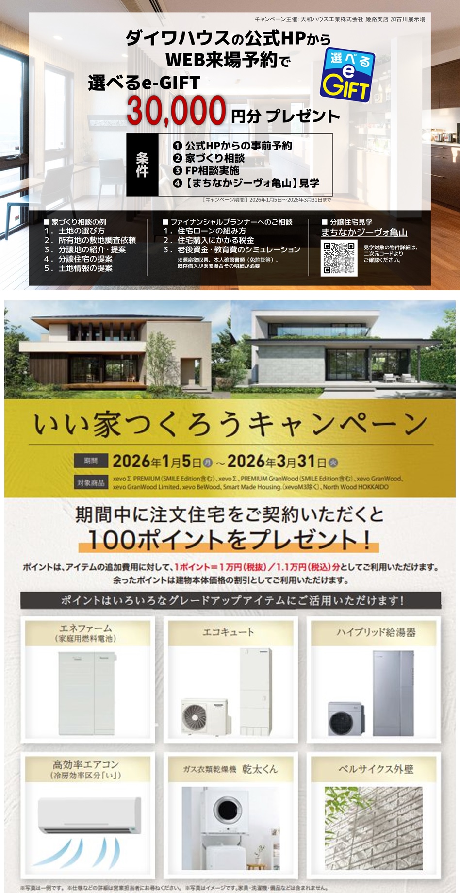 ※この特典は「大和ハウス工業(株)姫路住宅営業所」による提供です。この内容についてのお問い合わせは「大和ハウス工業 姫路住宅営業所079-285-2152」までお願いいたします。