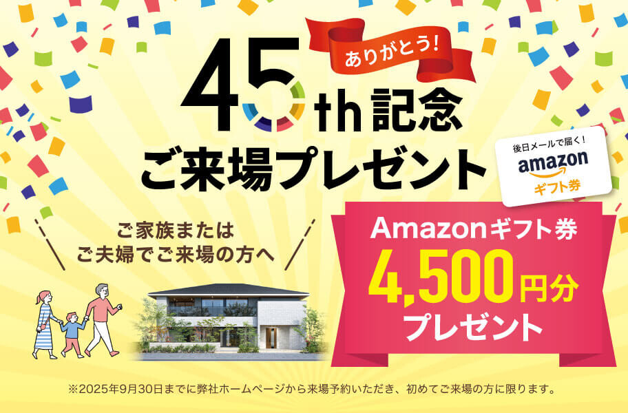※Amazonギフト券プレゼントは、アルネットホーム公式ホームページからの予約(下記関連リンク「来場予約はこちら」または「展示場の詳細はコチラ」)からご予約いただいた方限定の特典です。総合展示場サイト内の「見学予約」フォームからのご予約は対象外となりますので、あらかじめご了承ください。