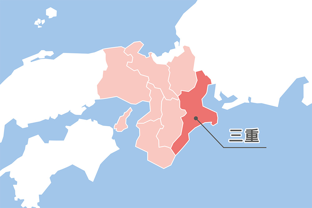 三重県は紀伊半島の東部、日本のほぼ真ん中に位置する県で、面積は全国25位の約5,774k㎡です。人口は、令和7年9月時点で約169万5,000人となっています。京都府、奈良県と和歌山県、滋賀県、愛知県、岐阜県、太平洋に面しています。三重県は、関西圏と中京圏の中間に位置し、双方の文化から影響を受けているのが特徴です。