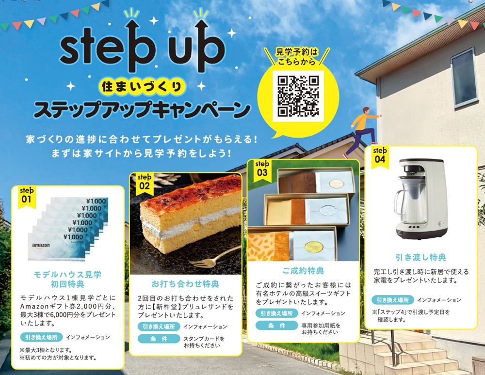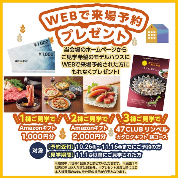 ※初回来店でモデルハウス1棟につきAmazonギフト券1,000円分、最大2棟まで。3棟ご見学で47CLUBリンベル カタログギフト 路コース。