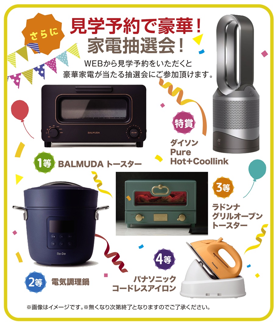 ※見学予約で豪華家電抽選会は、すでにご見学したことがあるモデルハウスへのご予約、また過去に家サイト見学予約特典を受け取っている方は対象外とさせていただきます。