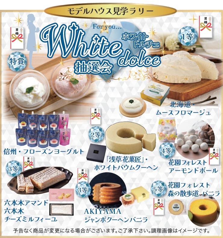 場内のモデルハウスを 3棟ご見学で「ホワイトドルチェ抽選会」にご参加いただけます♪
