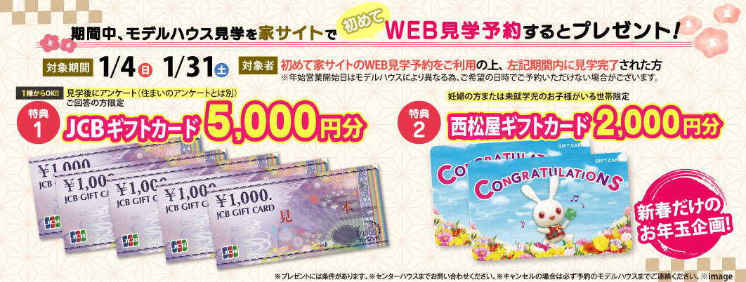 ※当申込フォームからご予約し、モデルハウスをご見学&センターハウスでアンケート記入された方が対象。