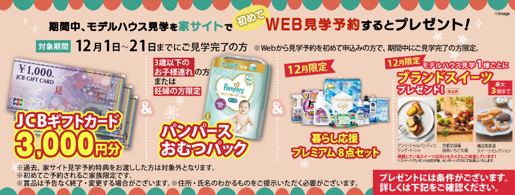 ※過去すでにお申込みいただき、見学予約特典をお渡しした方は対象外となります。また、お電話でのご予約の場合も対象外となります。予めご了承下さい。