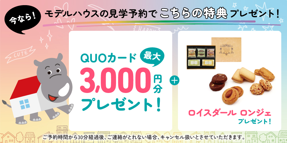 ※プレゼントは1モデルハウスにつき「QUOカード1,000円分」、期間を問わず最大1家族様3モデルハウスまでとなります。同一モデルハウスでの2回目以降のご予約をされた方や過去に当会場の予約特典を累積3棟分受け取られた方はプレゼント対象外となります。※プレゼントお渡し時にはご本人様確認のため、身分証の提示が必要となります。※モデルハウスは事前予約なしでもご見学頂けます。