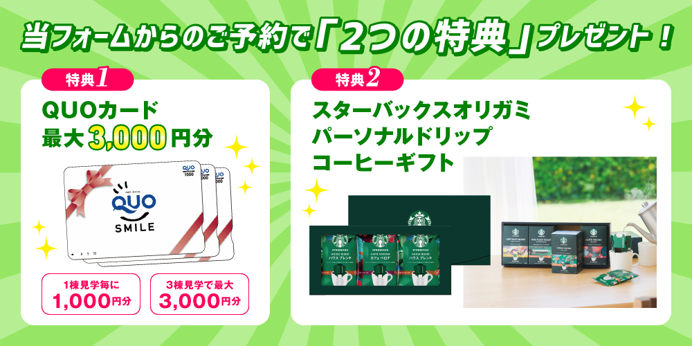 ※プレゼントは1モデルハウスにつき「QUOカード1,000円分」、期間を問わず最大1家族様3モデルハウスまでとなります。同一モデルハウスでの2回目以降のご予約をされた方や過去に当会場の予約特典を累積3棟分受け取られた方はプレゼント対象外となります。※プレゼントお渡し時にはご本人様確認のため、身分証の提示が必要となります。※特典2は無くなり次第終了となります。