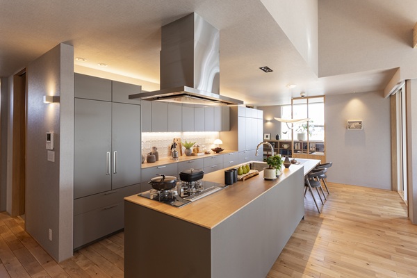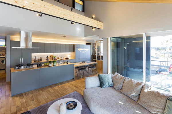 住友林業の強靭な構造「ビッグフレーム構法」により、外部空間と一体感を感じることが出来る開放感のあるLDK空間を実現しました。外観は、シンプルな大屋根を基調としながらも、軒の深さを強調した安定感のあるデザインとし、内観は、大きな勾配天井に当社らしい贅沢でダイナミックな木質感を演出しております。住友林業の「プラスカイ」を活かした、将来的に1階部分で簡潔できる間取りを取り入れておりますので、平屋としてもご見学いただけます。線の美しさからあふれる綺麗な空間、大開口の窓が生み出す開放感、木に包まれる安心感、住友林業の「今」をぜひご体感くださいませ。