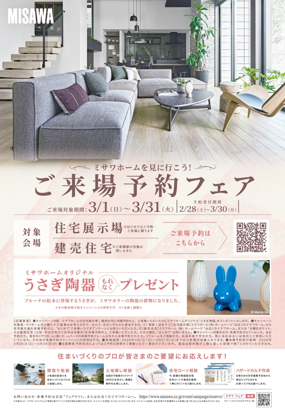 イベント期間中、WEB予約の上、ミサワホームの展示場にご来場いただき、アンケートにご回答いただいた方には、『ミサワホームオリジナルうさぎ陶器』をもれなくプレゼントいたします。