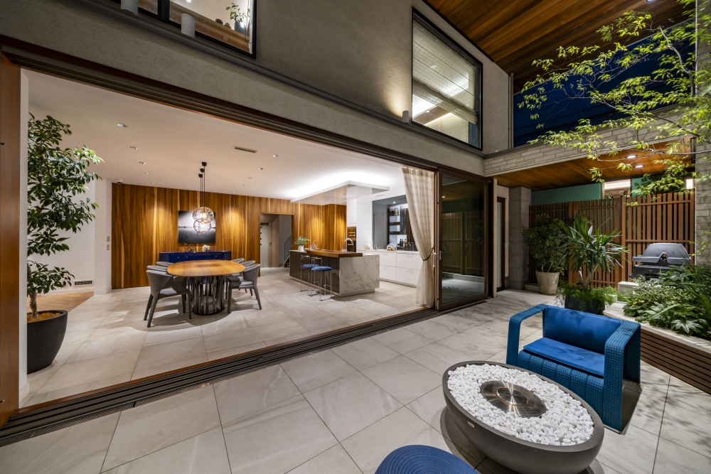 広々としたリビングはそのまま屋外空間へと溶け込み、
