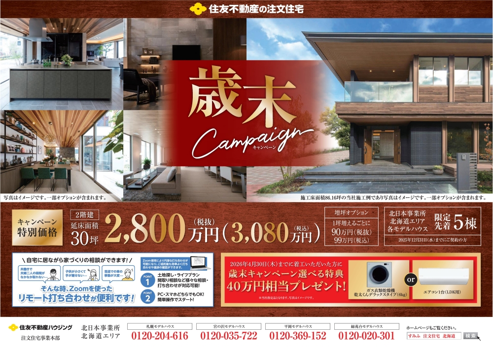 さらに、2026年4月30日(木)までに着工いただいた方には、歳末キャンペーン選べる特典(40万円相当)として
