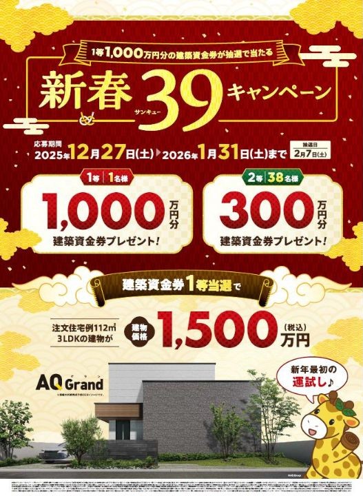 最大で建築資金券1,000万円分が当たる総額1.2億円キャンペーン