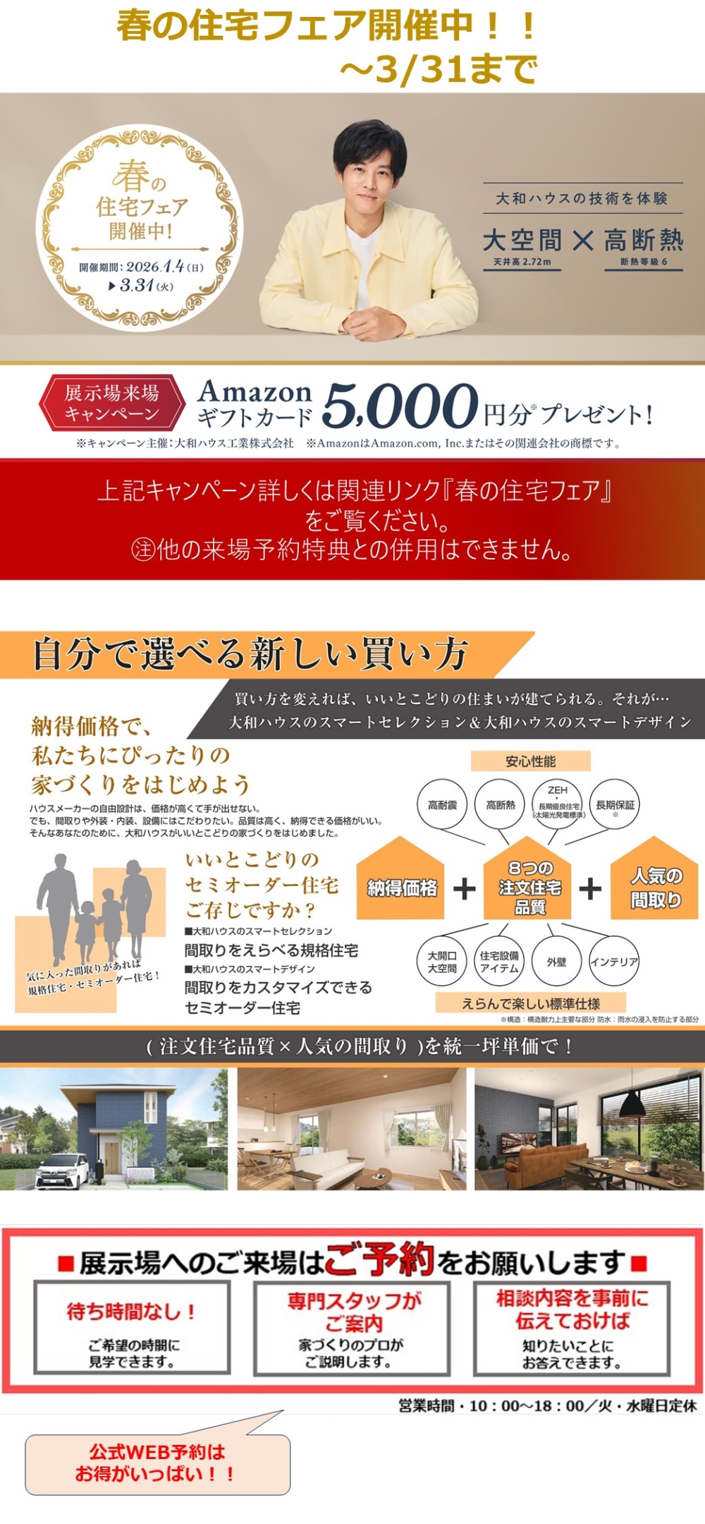 2026年1月4日~3月31日の期間中、大和ハウスの公式WEBサイトから「住宅展示場」にご予約の上、ご来場いただき、各種相談(AIプラン診断、ファイナンシャルプランナーによるライフプラン相談(無料)、土地の敷地調査、物件見学、建物見学)の次回の商談を予約&実施いただいた方には「Amazonギフトカード5,000円分」をプレゼントします。