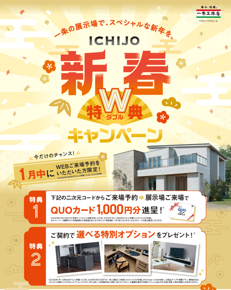 ※2026年1月~2月8日までにご来場いただき、2026年3月31日までに一条工務店とご契約いただいた方が対象。