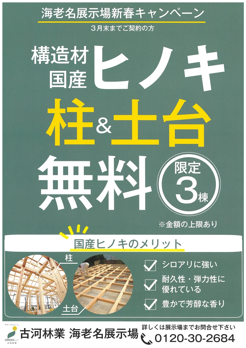3月末までご契約の方へ、国産材ヒノキの柱と土台を無料提供いたします。