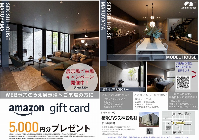 『積水ハウス円山展示場』とWEBにてご検索後サイトより来場予約して頂き、後日積水ハウス円山展示場へご来場くださった方(1家族1回限り)へAmazonギフトカード5000円分をプレゼント致します。