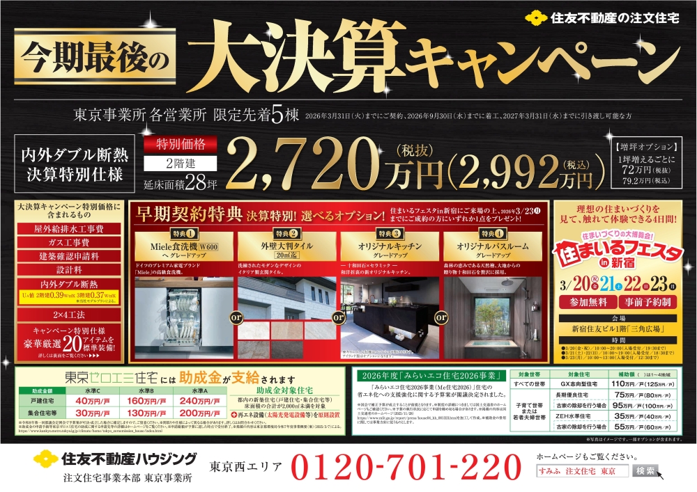 また、3/20(金)~23(月)に開催される住まいるフェスタin新宿にご来場の上、2026年3月23日(月)までにご成約の方には、早期契約特典として Miele食洗機W600 へのグレードアップ、外壁大判タイル(20㎡まで)、オリジナルキッチン グレードアップ、オリジナルバスルーム グレードアップ、のいずれかをプレゼントいたします!
