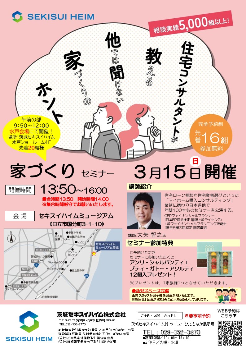 【セキスイハイム】日立会場残り2組です!家づくりセミナー開催!