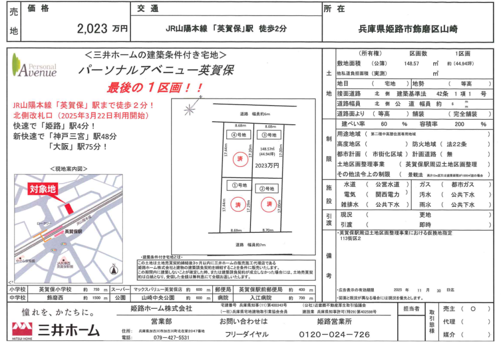 この度、JR「英賀保」駅から徒歩2分という好立地に位置する、広々とした148.57㎡(44.94坪)の土地が、2023万円という大変魅力的な価格で販売中です。