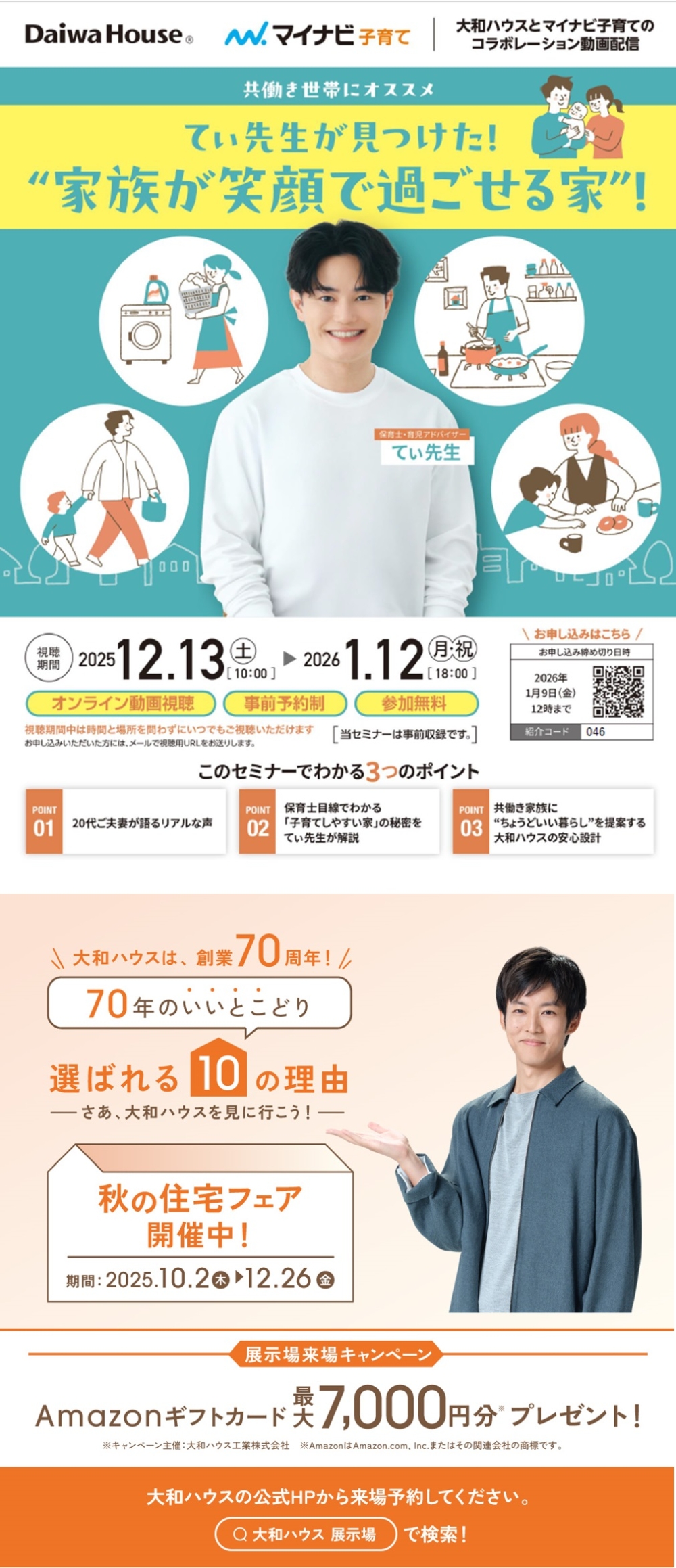 2025 年 10 月 2 日~12 月 26 日の期間中、大和ハウスの公式 WEB サイトから「住宅展示場」にご予約の上、ご来場いただいた方には「Amazon ギフトカード 4,000 円分」をプレゼント。