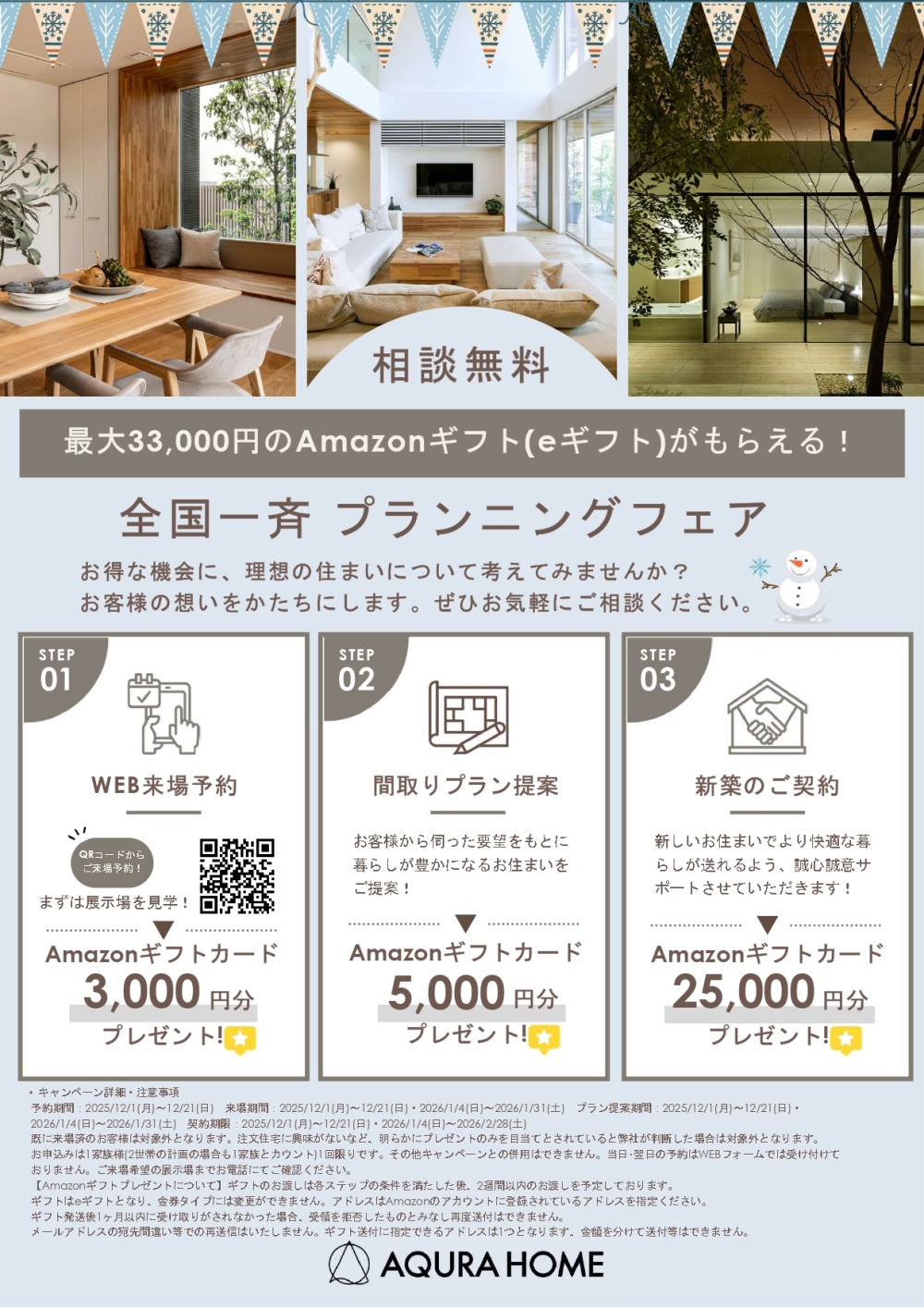 12月末までのご来場予約(ご来場日は1月まで)で最大33,000円分のAmazonギフトカードがもらえるプランニングフェア開催!
