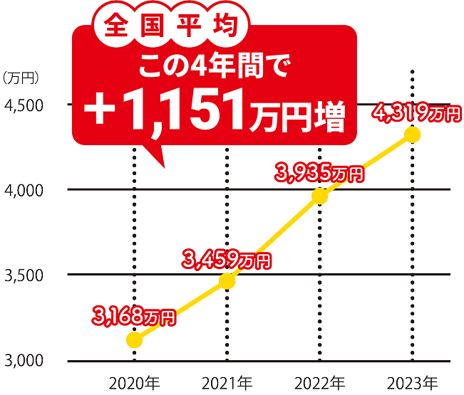 費用は2020年から比較すると全国平均で+1,151万円、三大都市圏平均では+1,560万円も上昇しています。ウッドショックやアイアンショックなどによる原材料の高騰や円安、労働賃金の上昇など様々な要因が費用に影響しているんです。