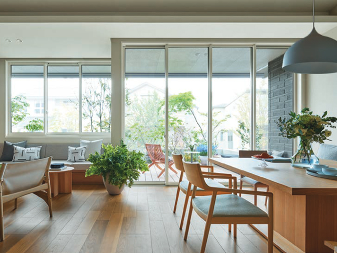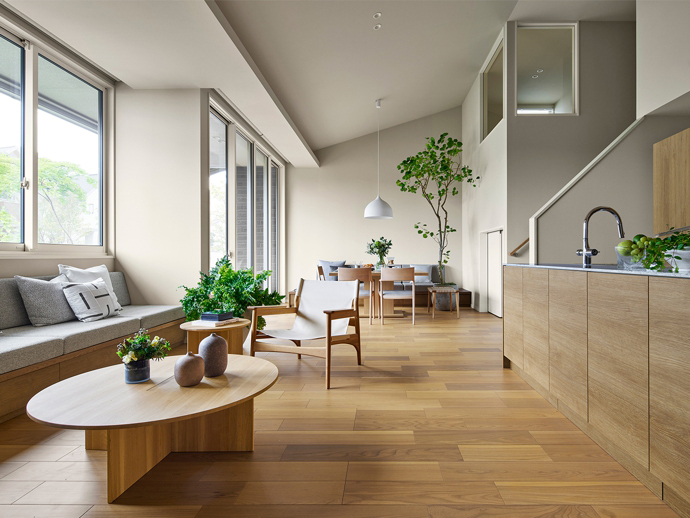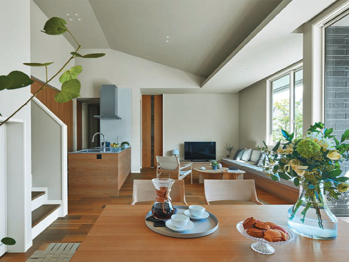 屋根形状に沿ってだんだん高くなる勾配高天井の変化に富んだ空間デザインで、高さ約4mのゆとりの大空間LDKを実現いたしました。